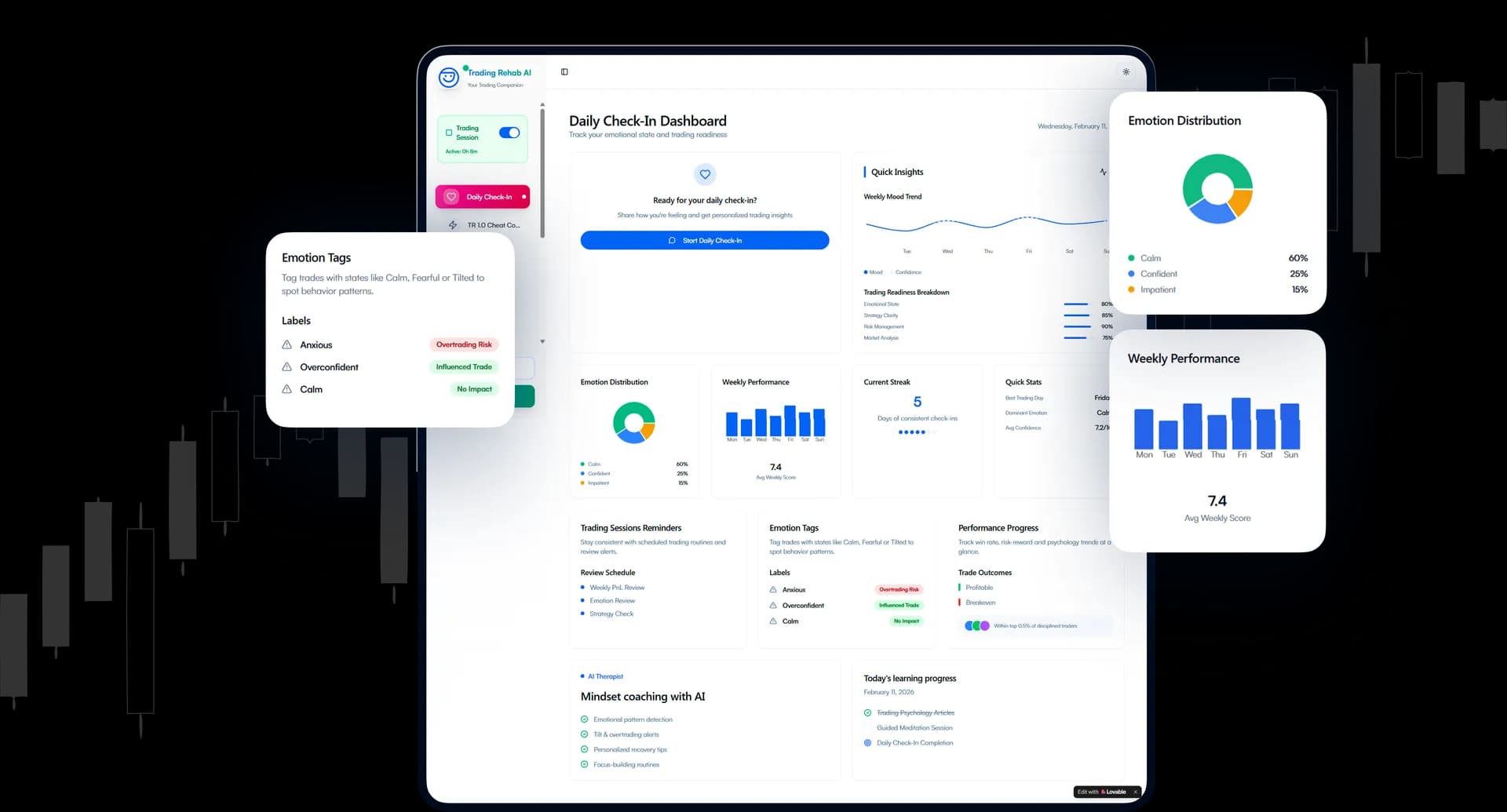 Traders struggled with revenge trading, overtrading, stress, and burnout. Existing tools tracked trades and emotions separately with no intelligence connecting them. The client needed real-time risk detection, emotional context understanding, and actionable guidance.